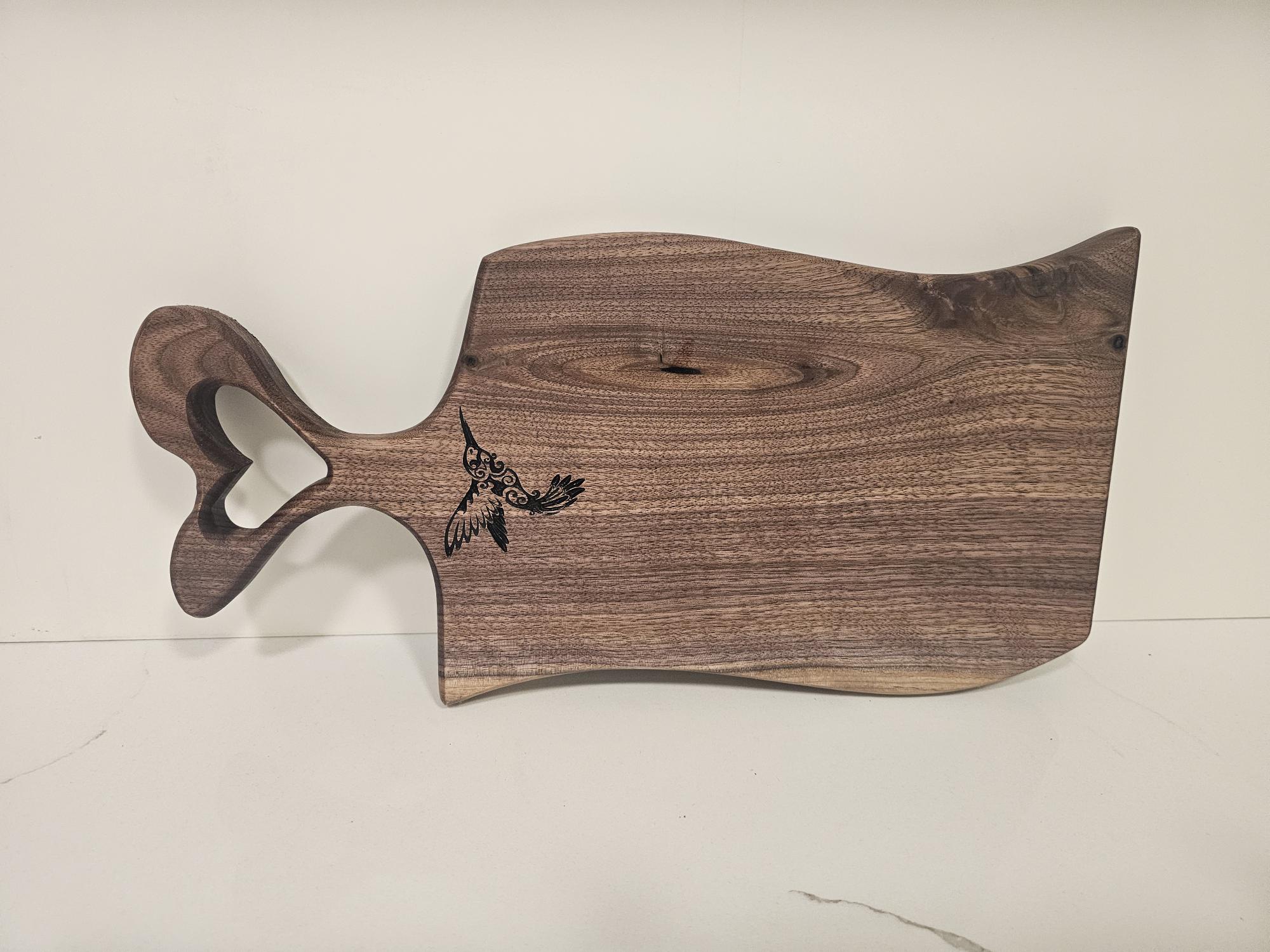 Carved from richly grained wood, this board features a gentle wavy shape and a beautifully engraved bird in flight—symbolizing freedom and grace. The heart-shaped cutout in the handle adds a lovely decorative touch, making it a perfect conversation piece.