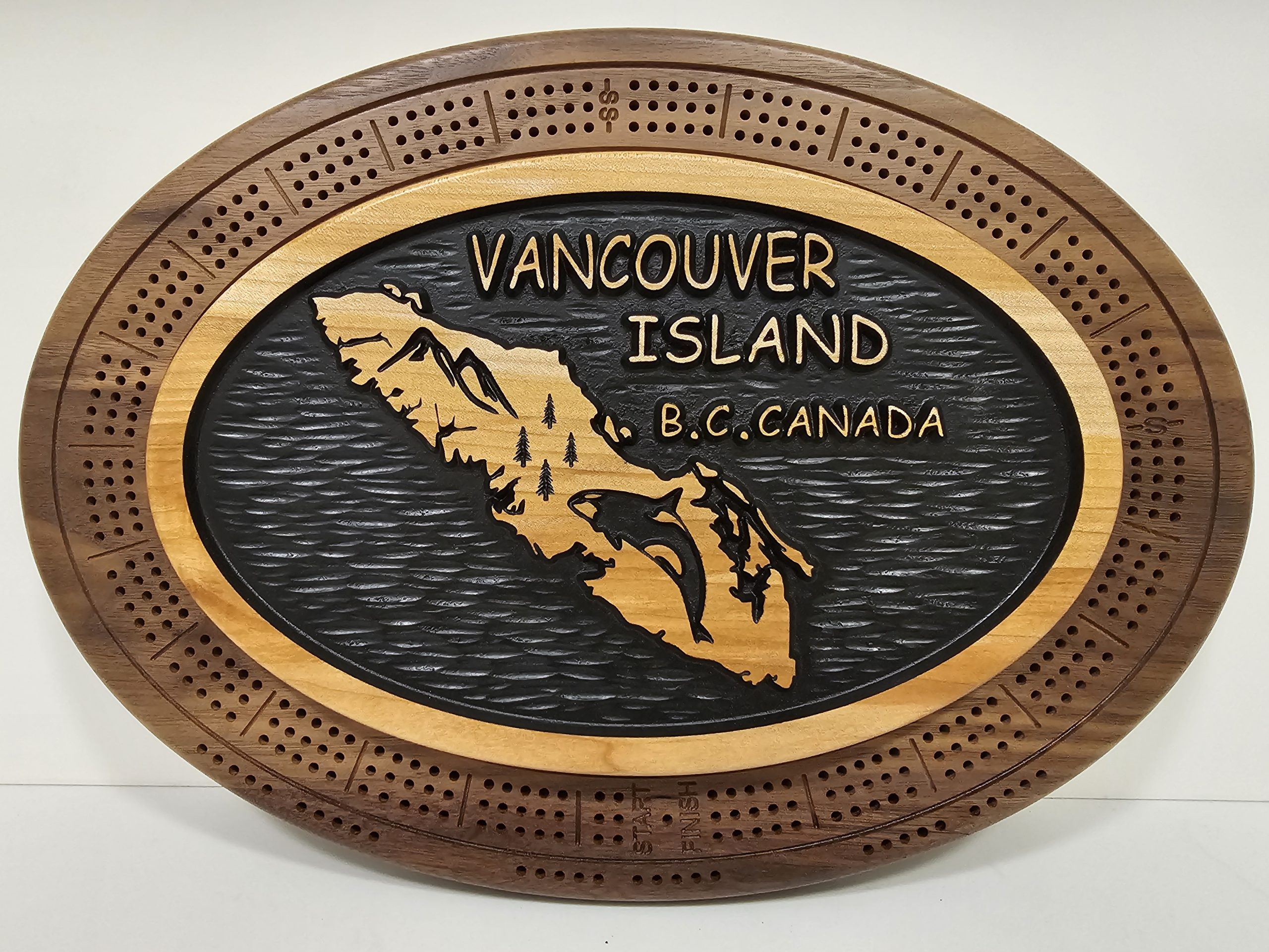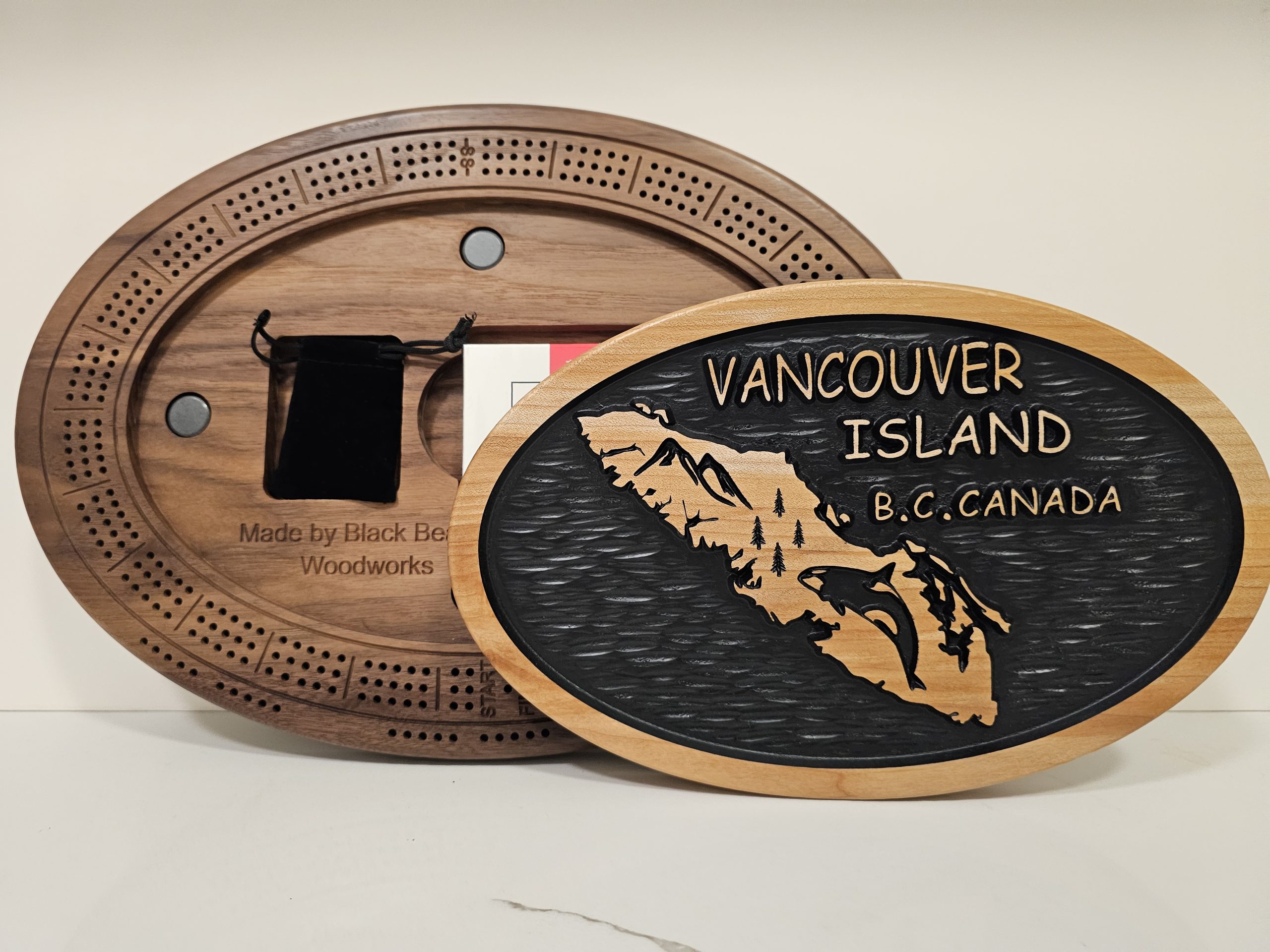 Celebrate the beauty of Vancouver Island, BC, Canada, with this stunning cribbage board. It is crafted from black walnut and cherry/maple wood pieces and features a magnetic closure and a bold, nature-inspired design.
