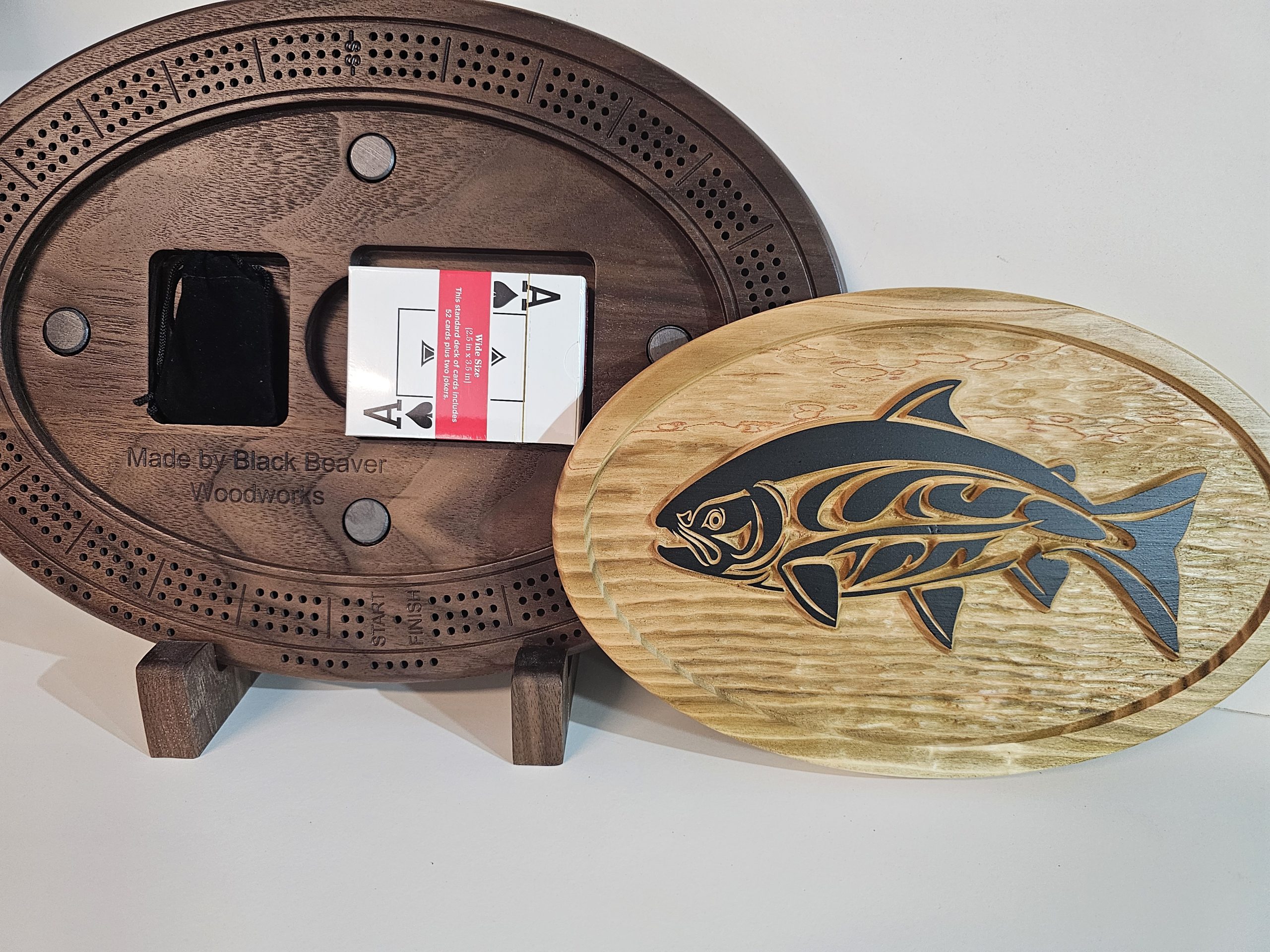 Whether you’re hosting game night or displaying it proudly in your home, this Natural Wood Native Salmon cribbage board is a true collector’s piece. It’s the ultimate blend of craftsmanship, cultural inspiration, and entertainment for cribbage players and art lovers alike.